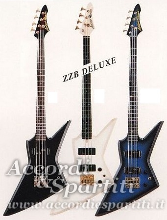 Lo ZZB Deluxe, come potete vedere dalle foto, è un basso molto aggressivo, che si basa sulla fortunata forma della Gibson Explorer, e ne rivisita in maniera molto efficace alcuni particolari. È composto da un solidissimo corpo in ontano, molto pesante, e un manico in acero ricavato da un singolo blocco di legno e avvitato al corpo. La giuntura tra manico e corpo è stata curvata in maniera molto ergonomica, per una migliore suonabilità a fondo tastiera. Questa è in palissandro e possiede 24 tasti (anche se in alcune versioni lo si può trovare con 22).