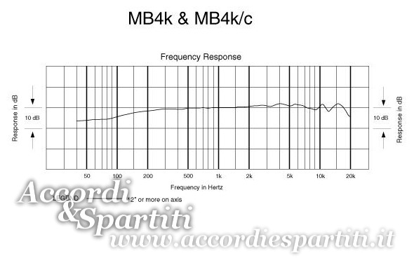- sensibilità circuito: MB 4k (phantom/Batteria): -46 dB (5.0 mV)/ -48 dB (3.9 mV) re 1V a 1 Pa; MB 5k: -58 dB (1.2 mV) re 1V a 1 Pa; MB 6k: -59 dB (1.1 mV) re 1V a 1 Pa