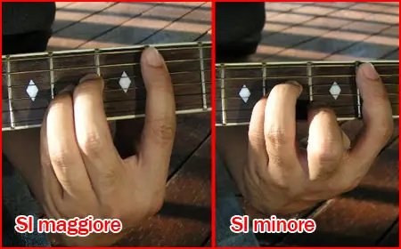 Bisogna però notare un particolare: per gli accordi in posizione di LA, il passaggio da maggiore a minore comporta il cambiamento delle dita, come si nota in figura sotto, per ovvie ragioni di comodità.